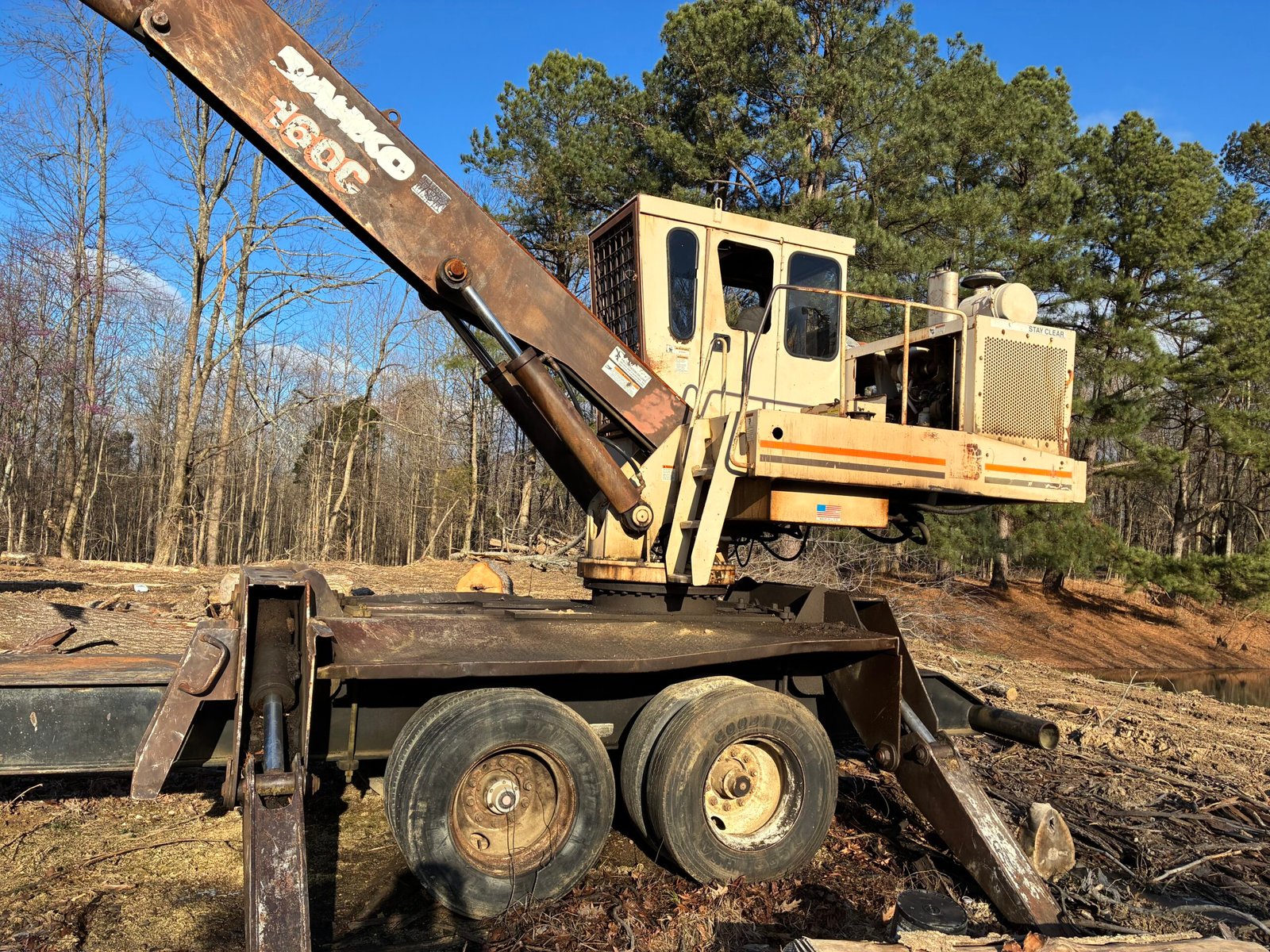 Barko 160C log loader, New 5.9 Cummings motor less than 1000 hrs ago, joystick control, hydraulics are good, a few loose pins just need some tightening, good running machine, trailer tires are fair, ready to work