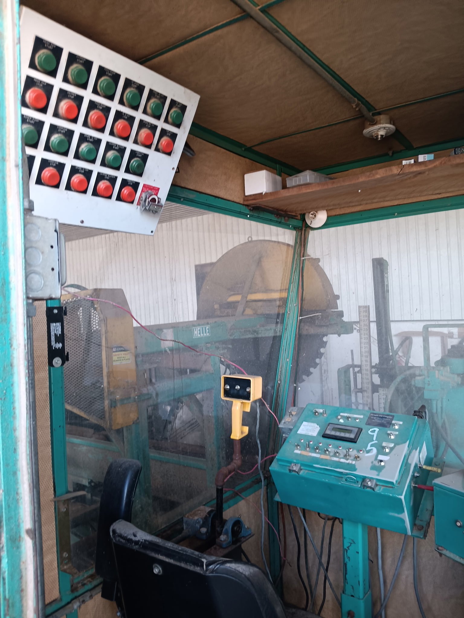 2010-13 Helle sawmill, 150 hp 3 phase, 3 headblock with top dog on it, 56” headsaw with top saw, 42 inch carriage, 60’ long track with drive, 3 saw Helle vertical edger, Helle log turner, hydraulic drive off bearing belt, complete Helle package. Only in production about 6 years, computerized Helle setworks, joystick system.